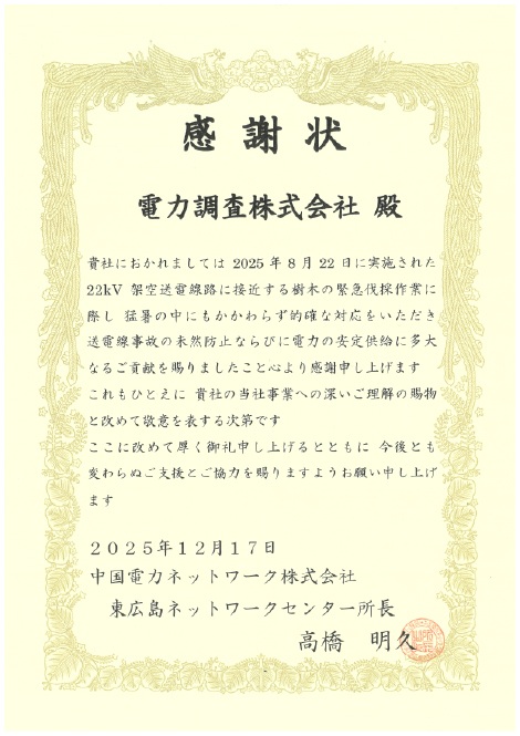 中国電力ネットワーク株式会社 東広島ネットワークセンター様から、2025年8月22日の緊急伐採作業の対応について感謝状をいただきました。 今後も安全作業に努めてまいります。
