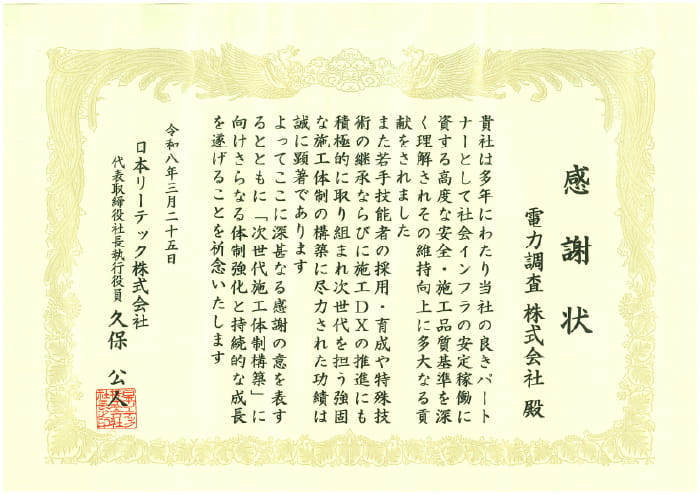 日本リーテック株式会社様から感謝状をいただきました。